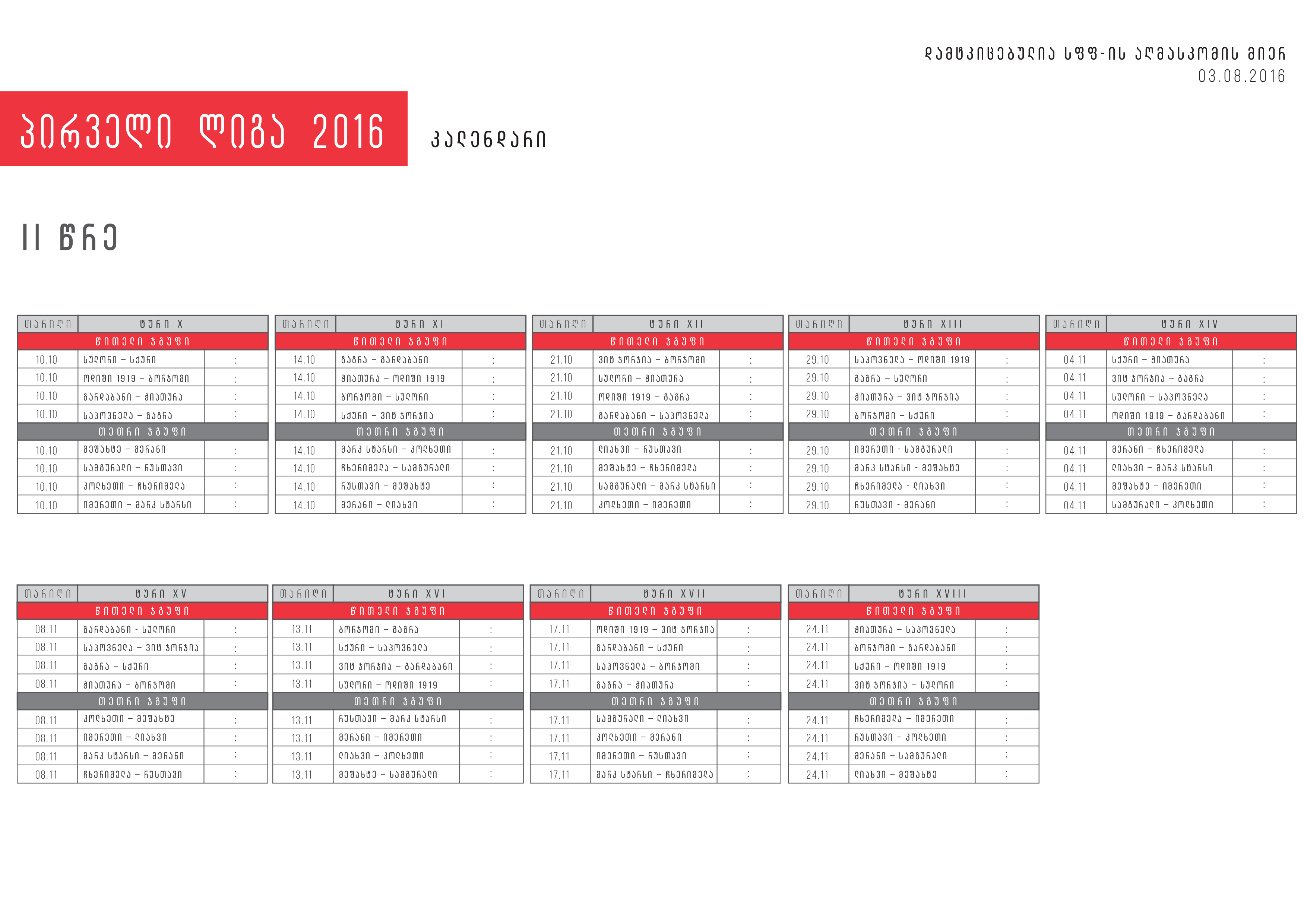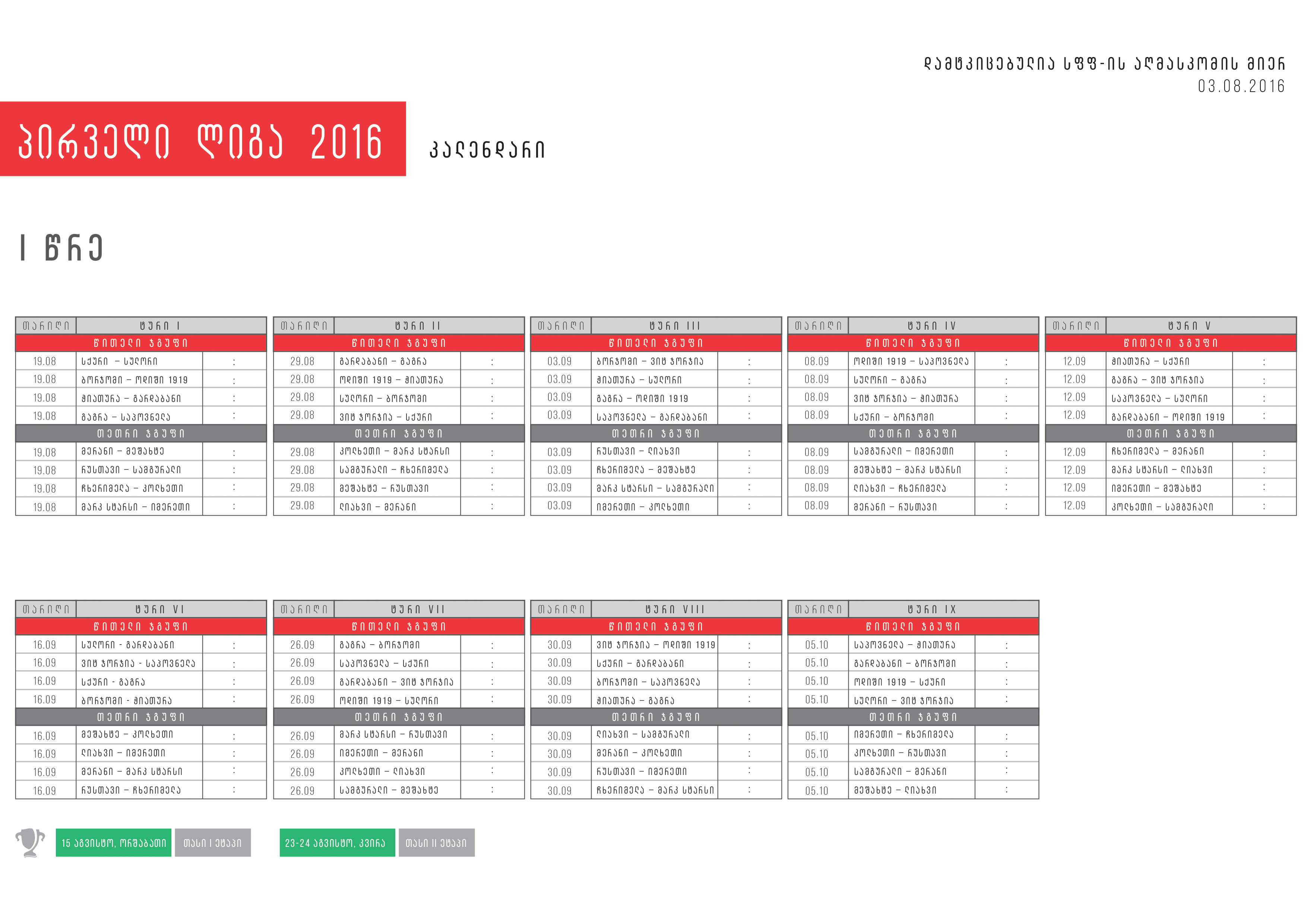 უმაღლეს ლიგაში გარდამავალი სეზონი 7 აგვისტოს დაიწყება, პირველი ლიგა კი, 19 აგვისტოს. რაც შეეხება საქართველოს დავით ყიფიანის სახელობის თასის გათამაშებას, ის 15 აგვისტოს აიღებს სტარტს.